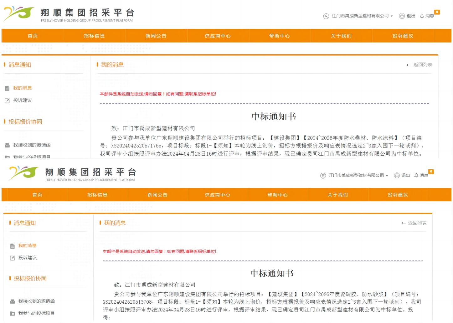2024年5月20日,我司再次憑借過(guò)硬的技術(shù)水平、扎實(shí)的綜合實(shí)力以及良好的企業(yè)信譽(yù),成功中標(biāo)廣東翔順建設(shè)集團(tuán)有限公司【2024-2026年度防水卷材、防水涂料】、【2024-2026年度瓷磚膠、防水砂漿】?jī)身?xiàng)招標(biāo)項(xiàng)目。